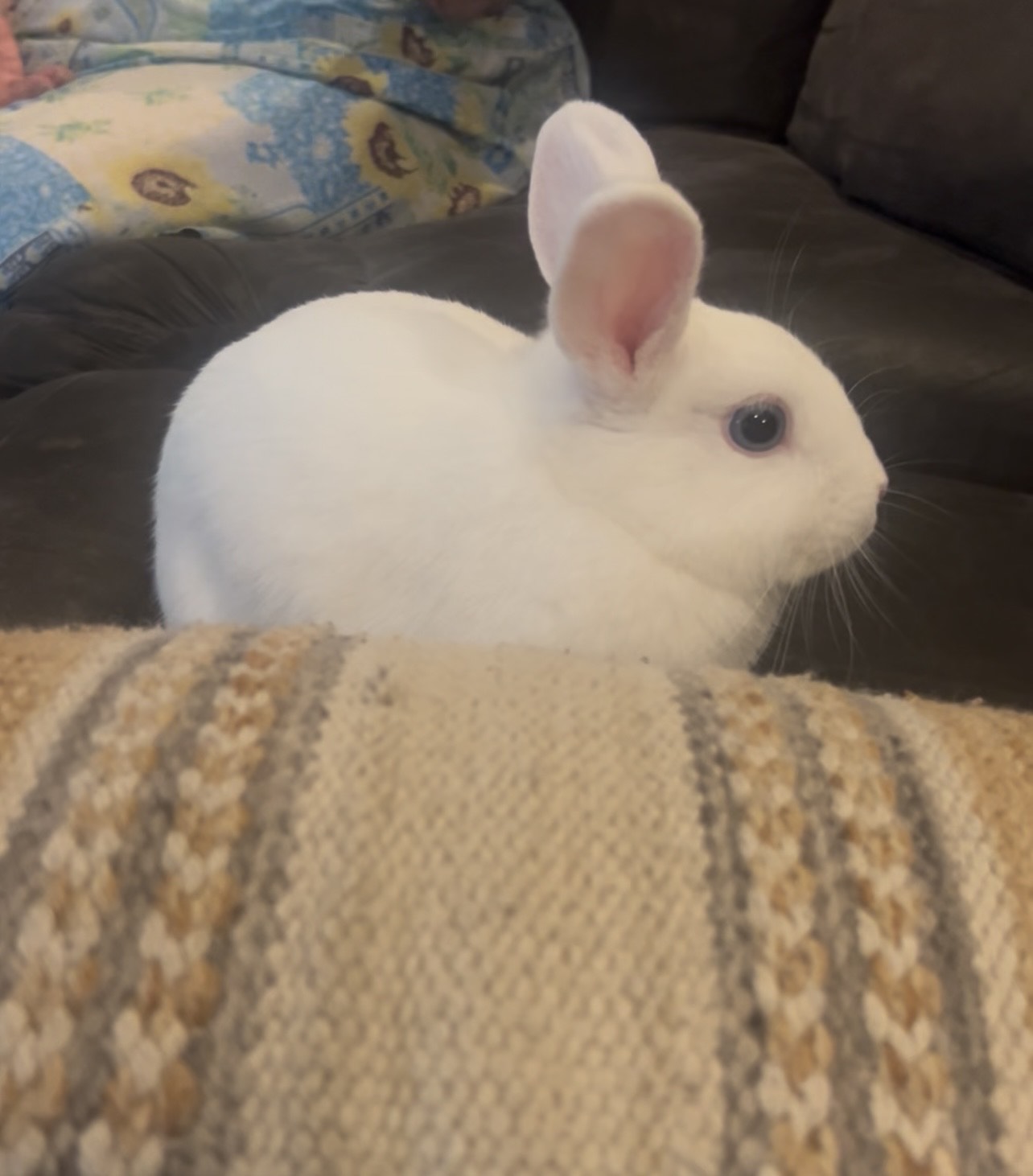 Tiny Fi is a free roaming, curious little bun, and you'll often see her zooming around the living room and laundry area. She has a great appetite, is a very clean bun in both her environment and self. She will sit for long periods of time on the couch to collect pets.
