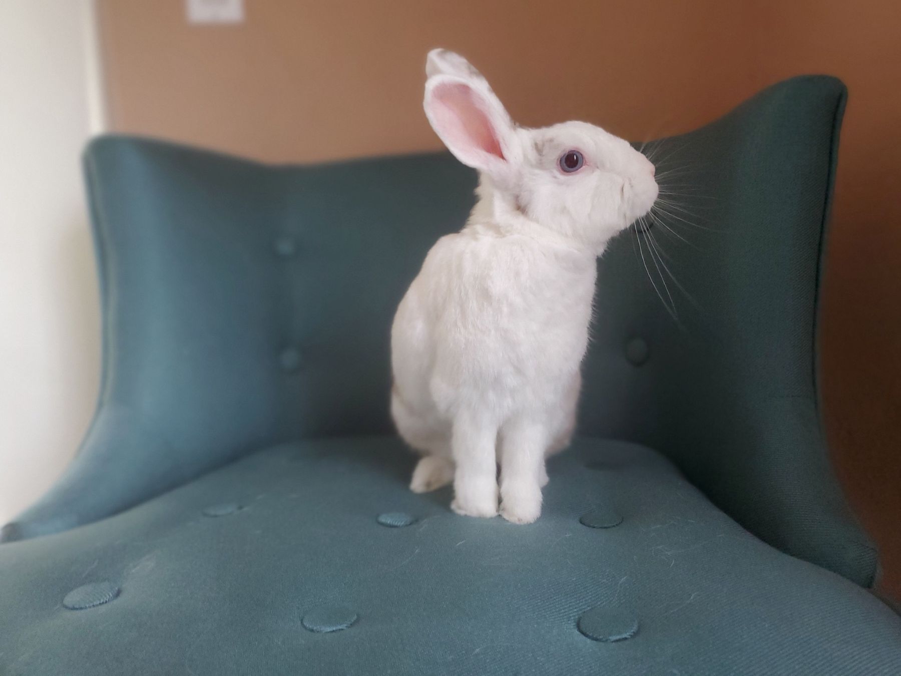 So far, he's been too scared to get along with other rabbits.