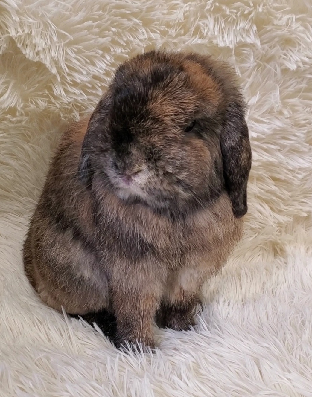 Our active young fellow can't get enough attention! His color pattern approaches black Harlequin, and he's a Holland Lop but as we say, the best and number one rabbit breed is RESCUED. It's important to know that although they are very popular, down-eared bunnies tend to have more health issues related to their ears and head shape, than up-eared rabbits do: ear infections, head tilt, dental disease, upper respiratory infections, and liver lobe torsion are all more common in Lops. If you can afford the added veterinary bills, please apply for him soon because he's likely to be adopted fast.